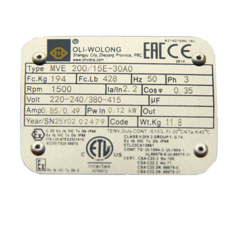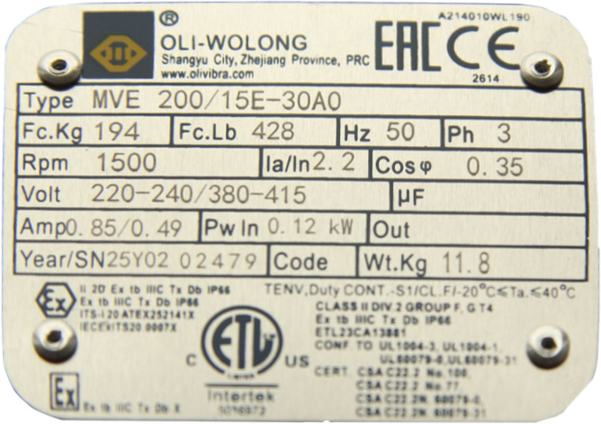 Технические характеристики вибратора OLI MVE 200/15